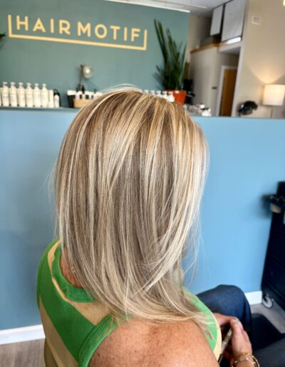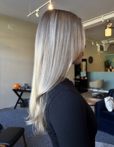 This service lightens the hair’s new growth up to two inches. It requires using a lightener rather than a dye to achieve the desired level of blonde. The hair is then glossed afterward to refine the tonality. The best maintenance is 6 to 8 weeks between appointments.